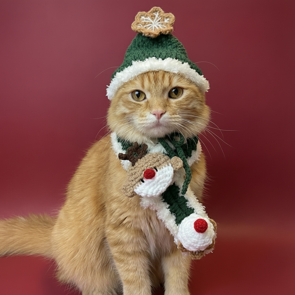 Keep your furry friend cozy and festive with this adorable crocheted hat and scarf set, finished with a classic white trim for that winter-perfect look! Made from soft polyester yarn, this set is gentle on fur, lightweight, and comfortable for everyday wear or holiday photos.